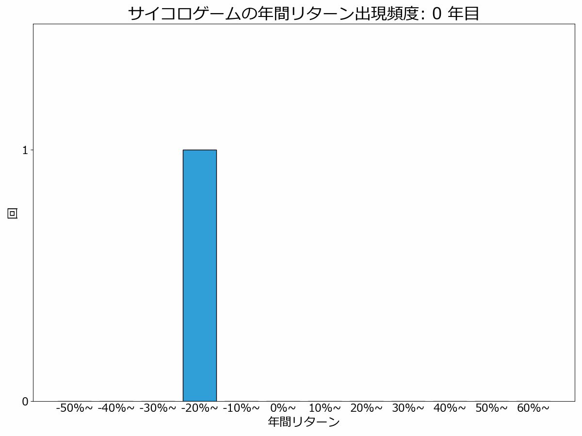 上記が、先ほどのゲームを1000年分プレイした結果、「各年のリターン」の出現頻度分布です。