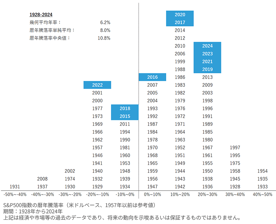 しかし注目すべきは、プラス30%以上になる年もあれば、マイナス20%以下になる年も多く生じている点です。